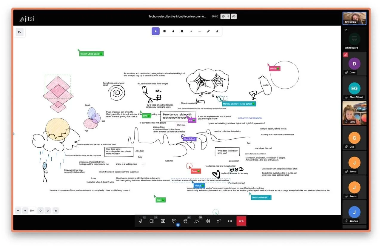 A central part of the gathering was a collaborative drawing exercise, hosted on a shared Zoom whiteboard. Participants created a collective visual map of mindful tech use capturing sensations, intentions, boundaries, emotional cues, and small rituals that help support conscious engagement with digital tools. This co-created artwork became a living expression of our collective digital awareness and the diversity of practices that sustain it.
