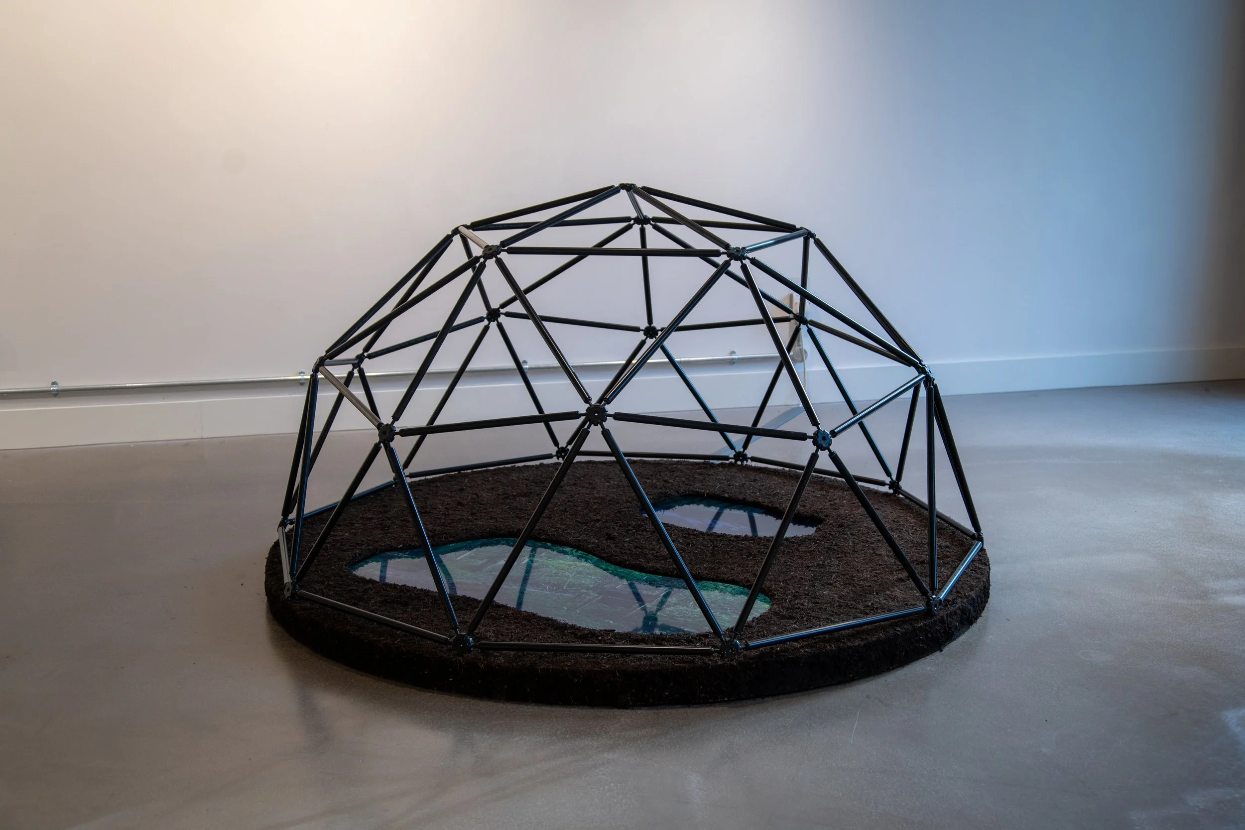 The geodesic dome that houses the films, built from MDF, soil, conduit pipe, beechwood dowel and Hubs dome connectors, references Buckminster Fuller’s utopian design experiments. Here, the dome becomes both satellite and sanctuary, a place that holds tension rather than resolve, transmitting a quiet story about presence, surveillance, and the porous edges between offline and online life.